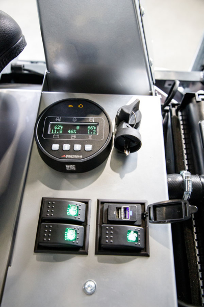 - Oświetlenie LED do pracy w warunkach słabego oświetlenia, port ładowania 12V oraz ergonomiczna platforma operatora zapewniająca komfort pracy.